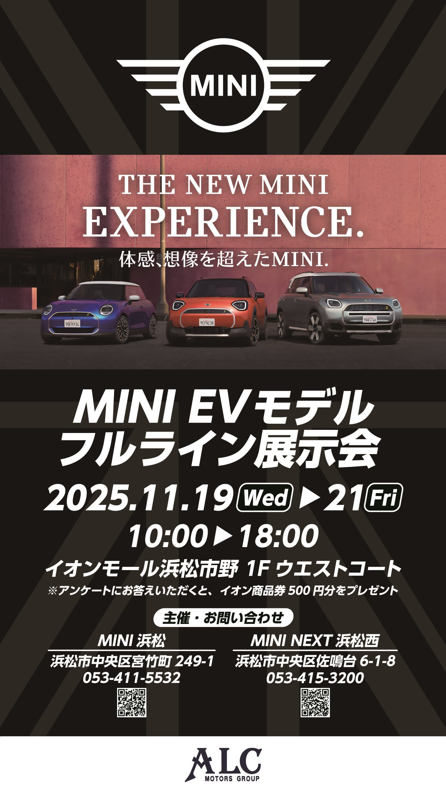 MINI浜松・MINI NEXT浜松西では、11月19日(水)・20日(木)・21日(金)の3日間、イオンモール浜松市野1階ウエストコートで、EVモデルフルライン展示会を開催します。展示するEVは、ミニカントリーマン、ミニエースマン、ミニクーパーの3台。いずれも国からのクリーンエネルギー自動車導入促進補助金の対象車です。イオンモール浜松市野でショッピングの際には、ミニのEVモデルをぜひご覧ください。