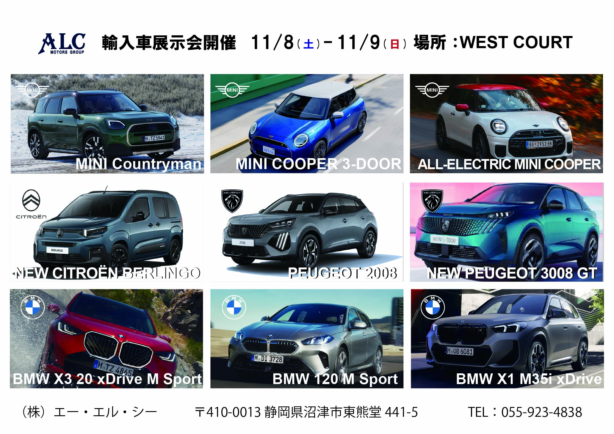 11月8日(土)11月9日(日)の2日間、ジ アウトレット湘南平塚・WEST COURTで、秋の輸入車展示会を行います。BMW、MINI、PEUGEOT、CITROËNの人気車種約10台を展示する予定で、会場でアンケートにお答えいただいた方にはプレゼントも用意しております。ショッピングの合間に、魅力的な輸入車をぜひ、ご覧になってください。 (展示車は色・グレードが異なる場合があります。)