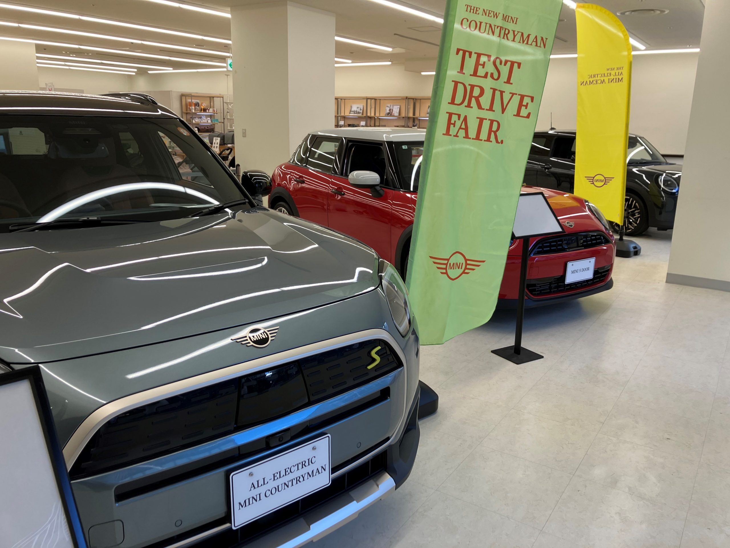 静岡伊勢丹1階「ALC プレミアムギャラリー静岡」では、優れた走破性の新型SUV「MINI COUNTRYMAN E」と「MINI 5DOOR」「MINI 3DOOR」 3台のミニを展示しています。いずれもミニのDNAを引き継ぐ魅惑的なクルマとなっております。ミニの展示は、11月16日(日)まで。試乗も受け付けておりますので、静岡伊勢丹にお越しの際は、ぜひ1階の「ALC プレミアムギャラリー静岡」へお立ち寄りください。